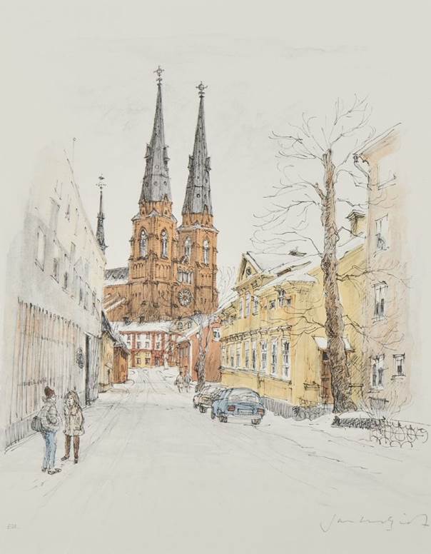 Upsalamiljö med Trefaldighetskyrkans torn, vinter